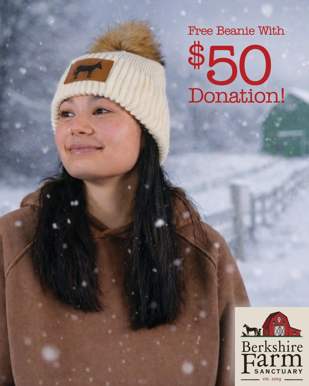 For a $50 donation, you’ll receive one of these super cute, super soft, super warm beanies featuring our famous donkey Bowie front and center 🫏💛 — with our logo proudly displayed on the back.